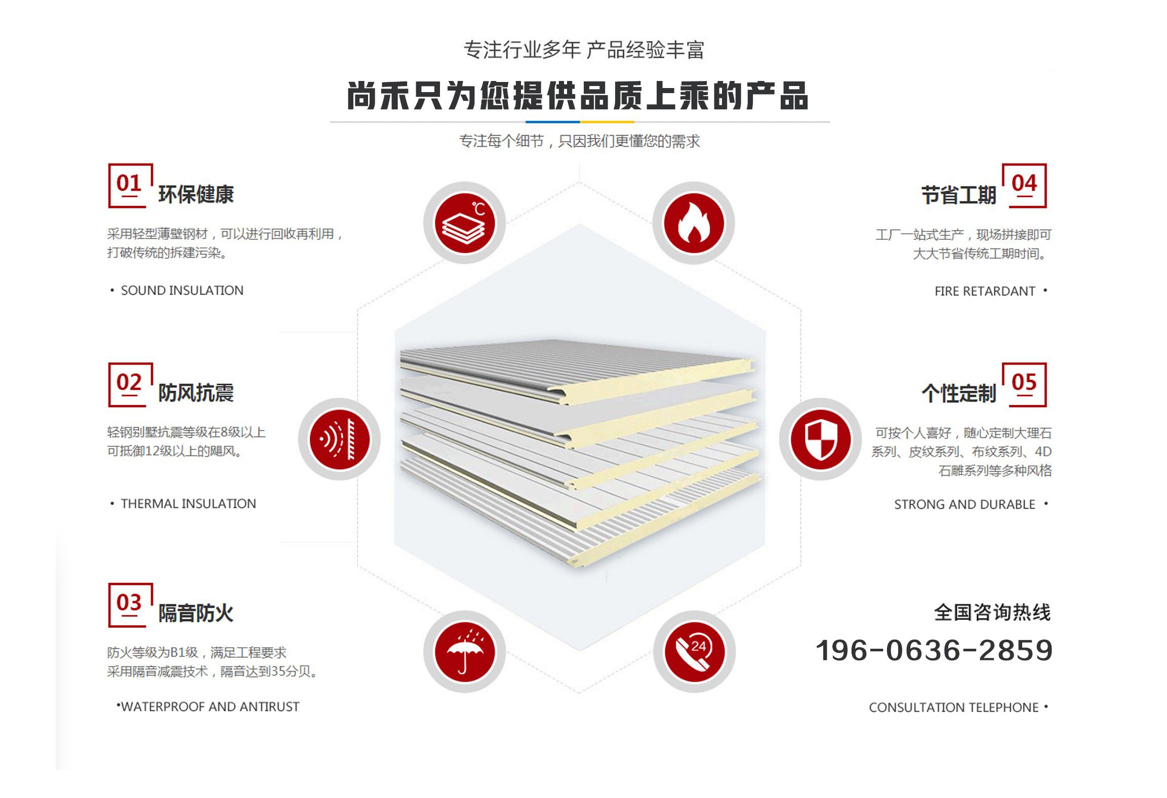 山東尚禾經(jīng)貿(mào)有限公司是集板材設(shè)計、研發(fā)、生產(chǎn)、施工、一體化的科技公司,并在同行業(yè)中率先通過了質(zhì)量、環(huán)境、安全管理體系認(rèn)證。公司2011年投入資金2000余萬元引進世界先進的聚氨酯節(jié)能板連續(xù)生產(chǎn)線、意大利進口發(fā)泡系統(tǒng),采用六組份在線自動操作混合澆注技術(shù),在線一次性完成社會配料中心或工廠的配比混合工藝,并可以根據(jù)溫度在線自動調(diào)整,從而生產(chǎn)處與眾不同的高強度、節(jié)能型、綠色環(huán)保的聚氨酯夾芯板。(其使用年限高于同行業(yè)其他品牌5-10年) 公司主要經(jīng)營范圍包括聚氨酯夾芯板,PU夾芯板,冷庫板,潔凈板,聚氨酯冷庫板,冷庫保溫板的設(shè)計、生產(chǎn)、銷售、技術(shù)指導(dǎo)、安裝及一體、以及進出口業(yè)務(wù),是中部六省最大的綠色節(jié)能建材生產(chǎn)基地。聚氨酯夾芯板年產(chǎn)200萬平方米、PU夾芯板、冷庫保溫板500萬平方米、鏈整產(chǎn)業(yè)綜合實力,開創(chuàng)了六省至中西部創(chuàng)新型中小名企總部基地,并將著力推進中國中西部地區(qū)集成房屋住宅產(chǎn)業(yè)化發(fā)展進程。 科技創(chuàng)新、節(jié)能典范。千萬間始終秉承“誠信、合作”的企業(yè)文化精髓,長期致力于鋼板材結(jié)構(gòu)節(jié)能建筑產(chǎn)業(yè),愿與社會各界攜手合作,共鑄綠色、環(huán)保美好未來。 產(chǎn)品具有良好的絕熱、阻燃、隔音、環(huán)保、耐久性能,可廣泛應(yīng)用于工業(yè)、商用建筑內(nèi)外墻、以及民用建筑外墻保溫、空調(diào)通風(fēng)系統(tǒng)、專用防火保溫門等領(lǐng)域。 我們始終秉承...